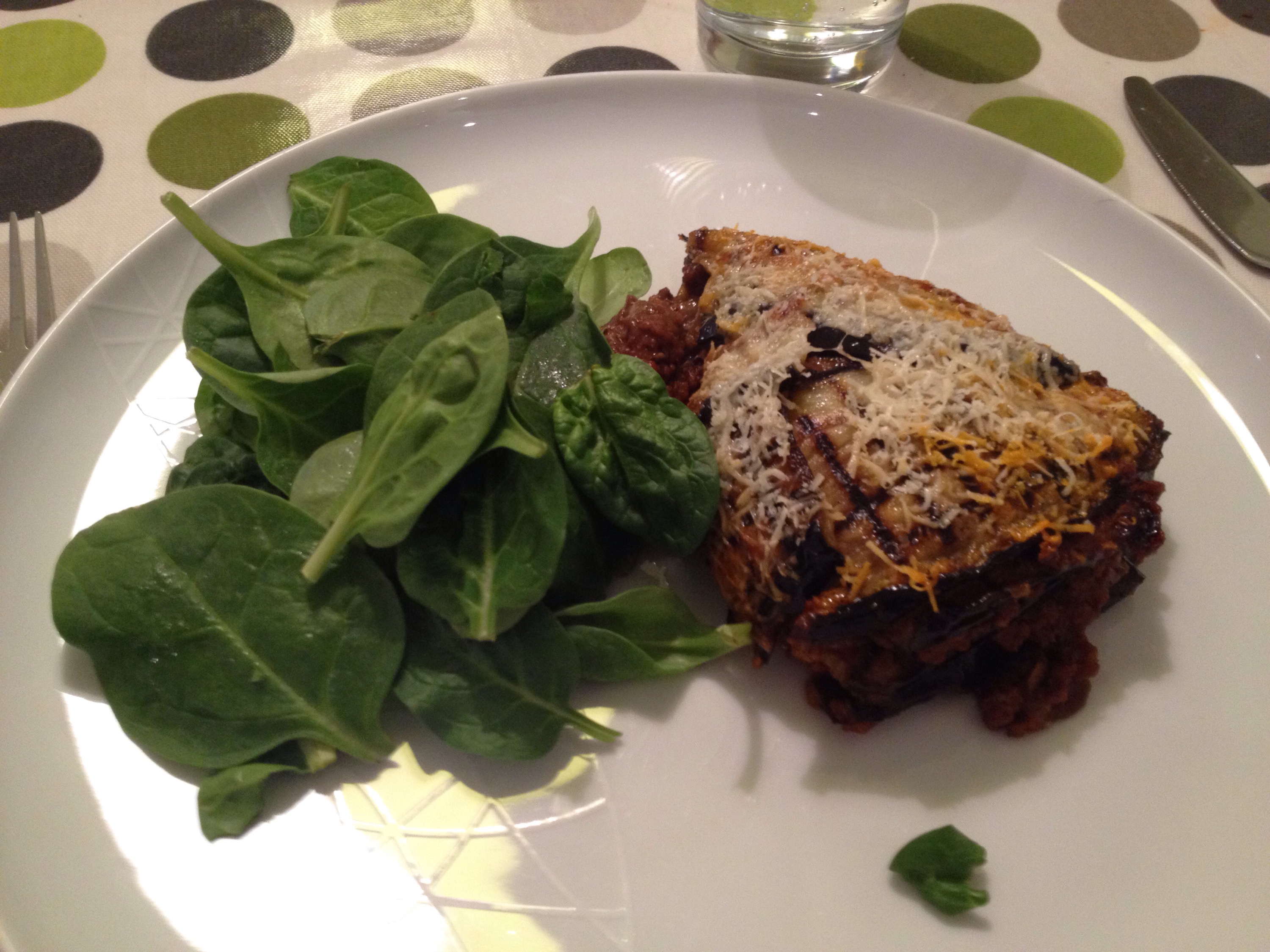 To assemble the lasagne, I sliced an aubergine lengthways, coated it with olive oil and seasoned with S&P, then cooked the slices, several at a time, in my griddle pan. (We love food with lines on it!) Once cool, I assembled the lasagne in a small oven proof dish starting with a thin layer of bolognese, then a single layer of aubergine, then bolognese, aubergine and so on. I think I had about 4 layers of each, ending in aubergine, then I grated lots of parmesan cheese on top. You could make a bechemel sauce but it was a Tuesday evening so I didn’t have much time, and it was plenty moist enough as it was.