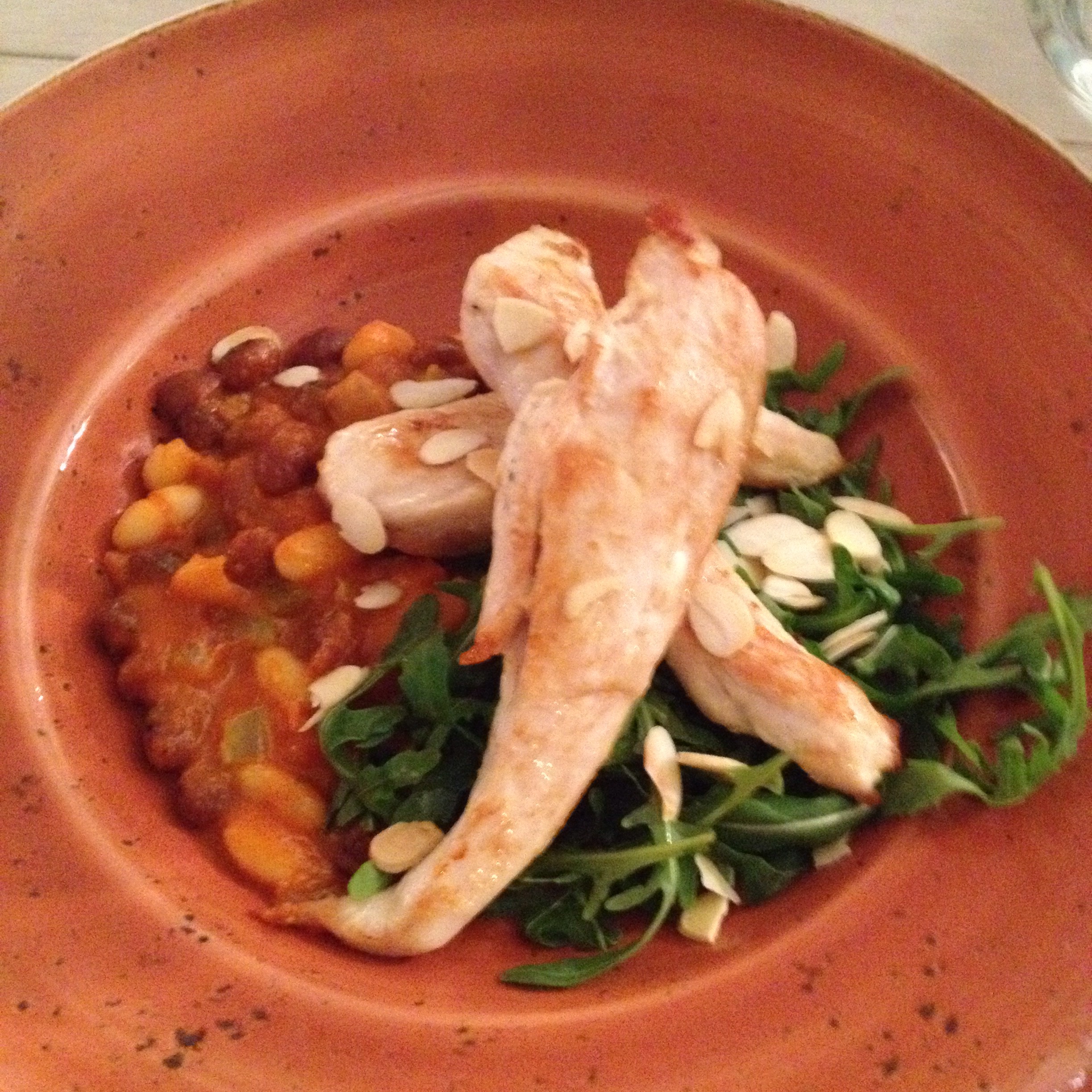 For mains, I had lemon chicken with mixed bean cassoulet and toasted almonds (pictured), Double chicken, I know – bit of a mistake really, but I really fancied the bean cassoulet rather than any the main courses, as I never cook it myself. As this was only a light bite, I also ordered a cauliflower, broccoli and parmesan bake, with seed topping. (Two starters = one main, right?) We had to wait quite a long time again before our main courses arrived – it seems like the kitchen is a bit over-run. The chicken wasn’t particularly lemony, but I thought the bean cassoulet was really delicious. Unfortunately, the broccoli and cauli bake had a very watery sauce, but the waiter was apologetic about it and took it off the bill. (New sous-chef apparently.) Hubby had the rib-eye steak, and it was cooked just as he asked – he was quite happy.