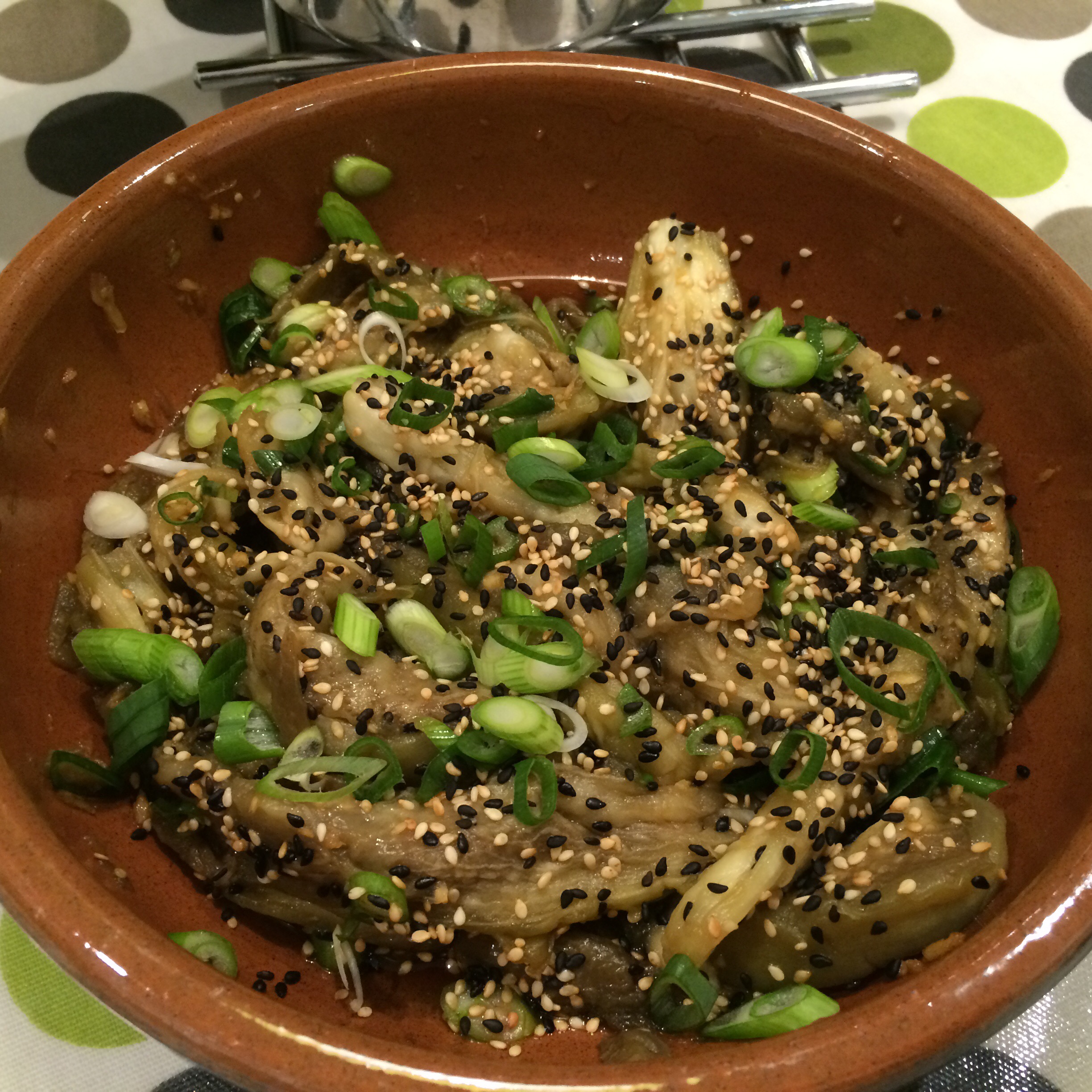 The second picture is aubergine with sesame and spring onion. This is genius and packed with oriental flavour. You only have to peel and steam the aubergines then tear them into strips and dress with a sauce made from mirin, sesame oil, rice vinegar, garlic, ginger and maple syrup. Top with toasted sesame seeds and shredded spring onions. Utterly delicious and fast to cook.
