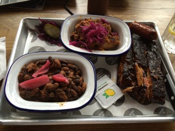 I chose a combination of pork spare ribs and pulled pork, with sides of pit beans and slaw. You can also see a sneaky hot link sausage in the picture that had crept on from somebody else’s tray.