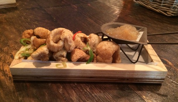 There weren’t many gluten free starters on offer except olives, chicken wings and pork crackling. We ordered some of the latter for a starter as the boys love a bit of crackling, and we were amused when it arrived on a tray with a miniature wheelbarrow of apple sauce with chilli and spring onion.