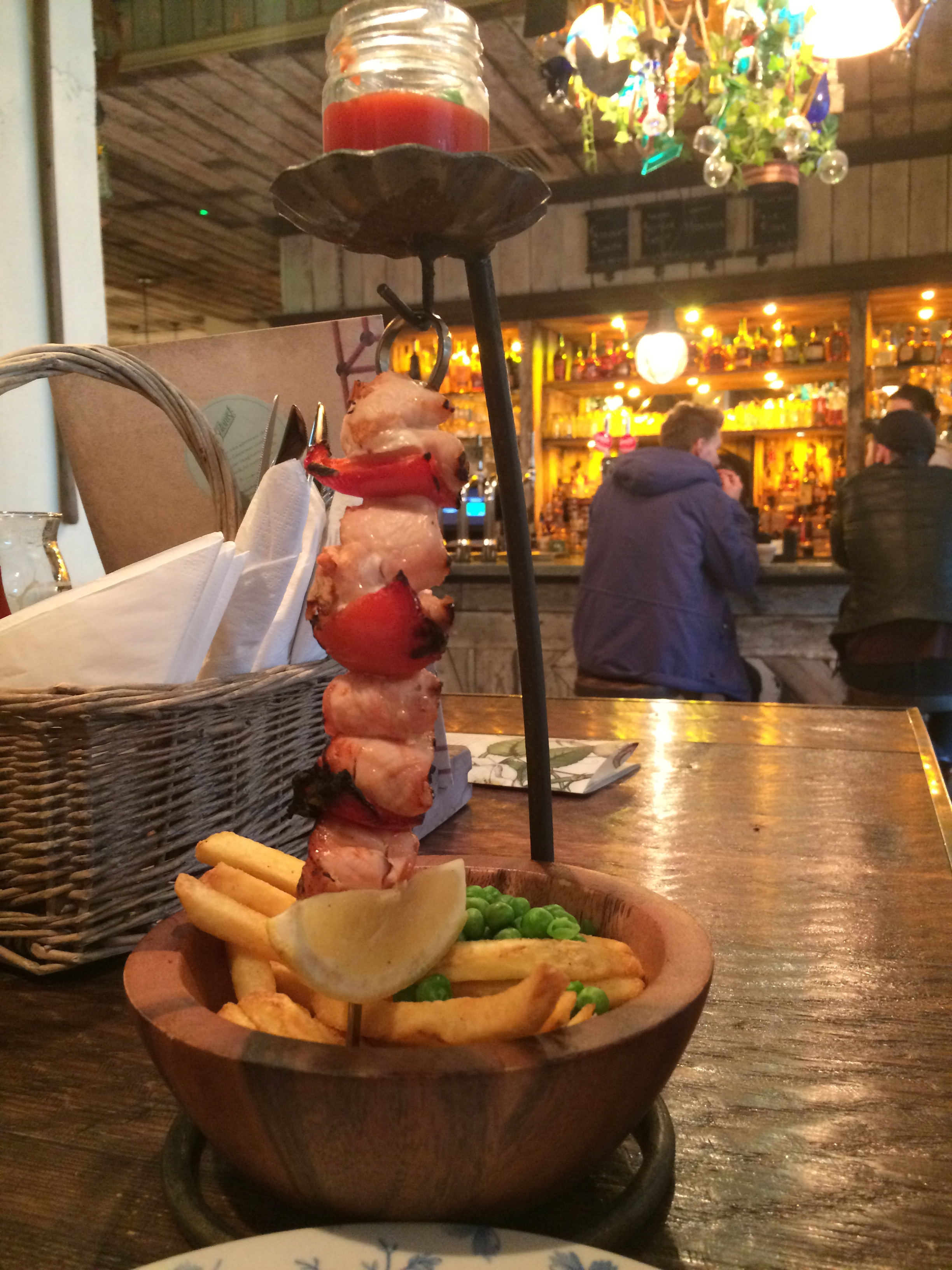 We all decided to go for kebabs which were rather spectacular, hanging on a cast iron stand with integrated sauce dribbler at the top! Chicken and pork were the gluten free options so I opted for the pork kebab and the kids had mini chicken ones from the kids’ menu. Nice to see something different from the usual fish fingers and pizza on the kids’ menu, although now I think about it. I suppose it was still chicken and chips, albeit served elaborately!
