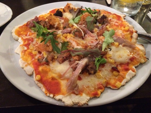 I opted for a flat bread, which are highlighted on the menu as being available as gluten free. I wondered why they didn’t call a pizza, but when it came I understood – the base was definitely more flat bread than pizza dough. My topping was meat feast and although one or two items had to be substituted, what I got was great. It included meatballs, bacon, ham hock and tandoori chicken, (which is a better combination than it sounds!) with sweetcorn and chillis and a teensy bit of salad to make it feel healthier than it is.