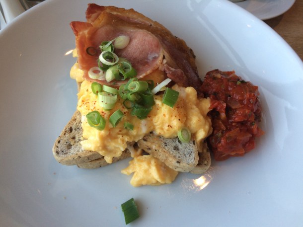 We were there for brunch, which is always a bit tricky for coeliacs – everything generally comes with bread / toast / bagels etc. But the kitchen has a special toaster for gluten free bread, and I was told most things could be tailored. The thing that caught my eye on the menu was the breakfast burrito – a spicy Mexican take on a cooked breakfast, with salsa, spring onion and GF hash browns! What’s not to love? Of course, I couldn’t have the wrap part of the burrito, but they made me a deconstructed version on GF toast, which was delicious:
