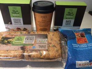 So whilst I was in M&S, I picked up few a few new (to me) products to try. M&S are getting in on the sandwich thins trend with this very soft and generously seeded version. I love their crispy toasts, so I got two kinds to try: apricot and cashew, and date and walnut. I also found a noodle pot, which wasn’t in the free from section, and some interesting looking sweet potato crisps with Harissa. (I quite like harissa – it’s most frequently used in my house to spice up scrambled eggs at the weekend.)