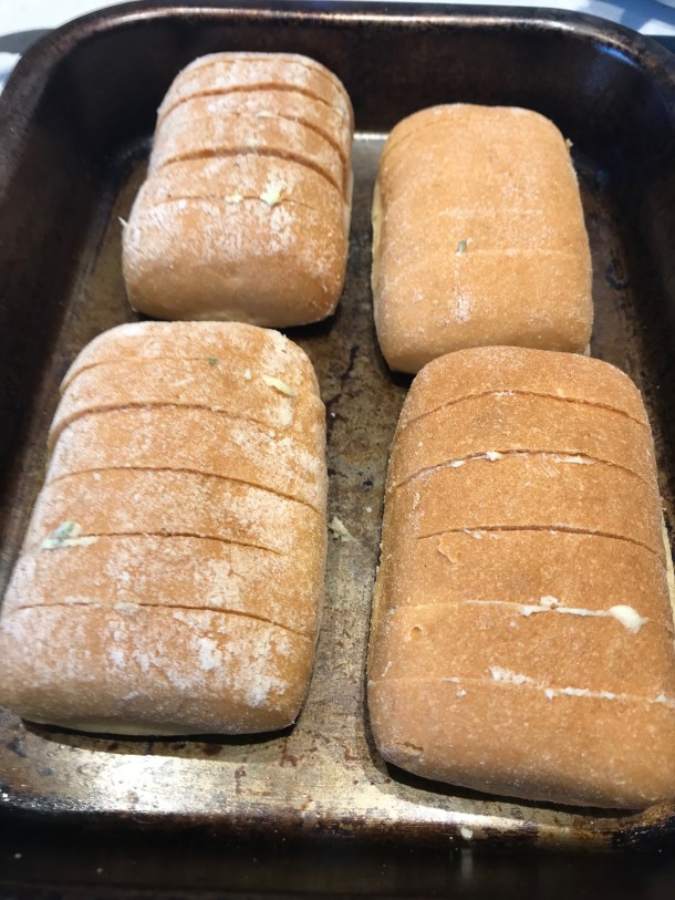Slice down into the rolls but without cutting all the way through – five cuts in each roll gave six decent sized pieces. Then spread a generous amount of the garlic butter in each.