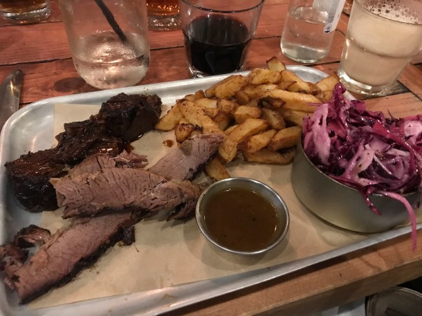 I opted for the brisket pit plate, as somebody had previously enjoyed it. This had smoked brisket and burnt ends (which is much tastier than it sounds) with chips and I chose a side of pickled slaw, which I went halves on with a friend who ordered sweet potato mash. There are plenty of choices, including steak, pork belly, chicken, pulled pork, and an assortment of sides including corn on the cob and greens, as a token gesture to vegetables!