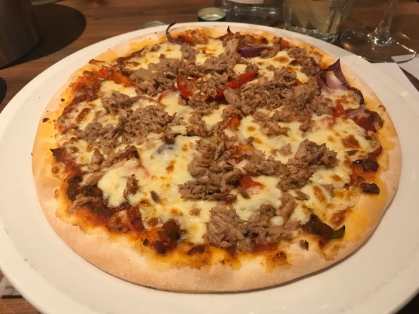 My main course was a pizza. I chose the Tonno Puttanesca, which included tuna, olives, capers, garlic, red onion, red peppers & chilli on a fiery* tomato base. The menu doesn’t mention mozzarella as a topping, so I asked for that as an extra.