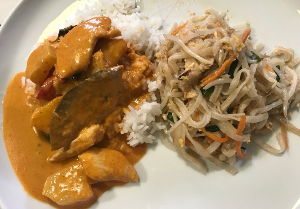 So we ordered a takeaway – some Thai fishcakes for a starter, followed by chicken Pad Thai and a red chicken Thai curry, with some steamed rice. I know there are very limited options on starters, but all of the curries are made gluten free, and probably some of the other stir fries can be. A conversation with the staff is definitely important, as I think they modify some of the recipes – certainly the Pad Thai.