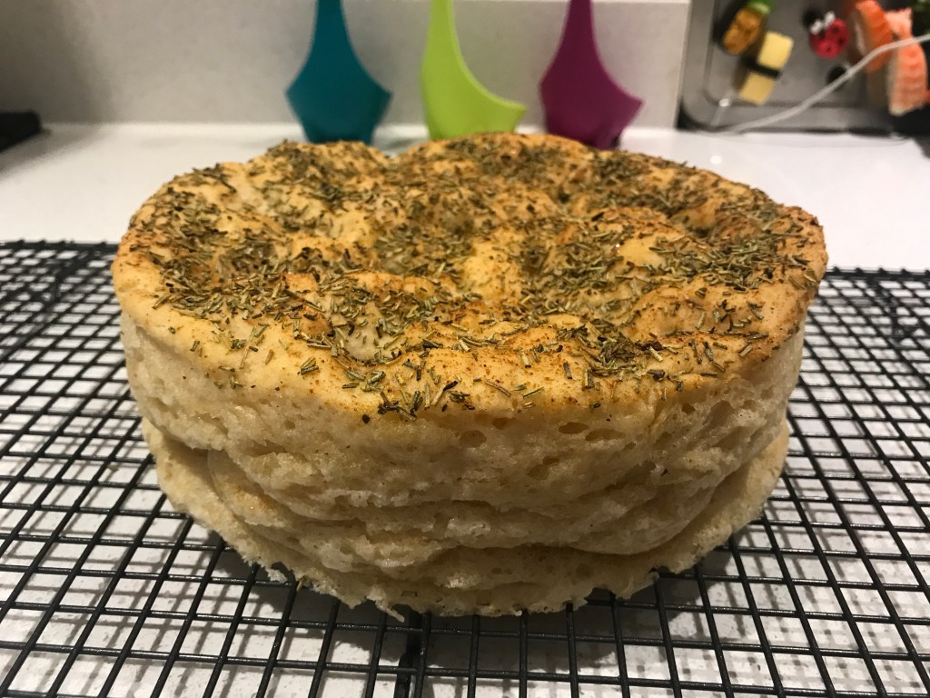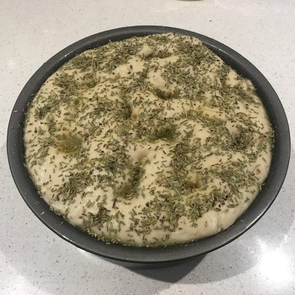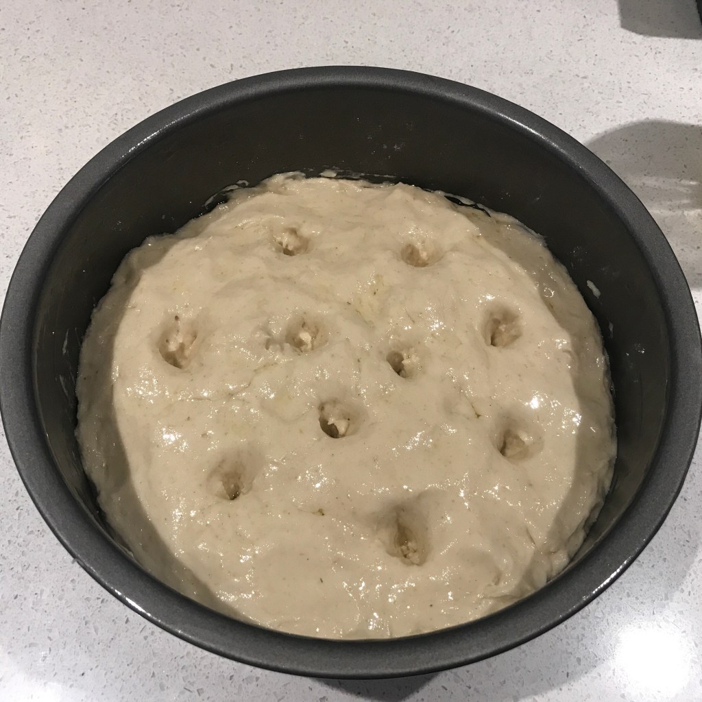 Once I did get hold of some yeast, the mix was really easy to make. This kit comes with a flour mix and two packets containing rosemary leaves and garlic powder. To make the bread, you just need to add water and salt (and the yeast, of course) to the bread mix, and you need to have a 20cm, cake tin, oiled. With a generous amount of oil on your hands, it’s fairly easy to flatten the top of the mix and make the dimples with your fingers.