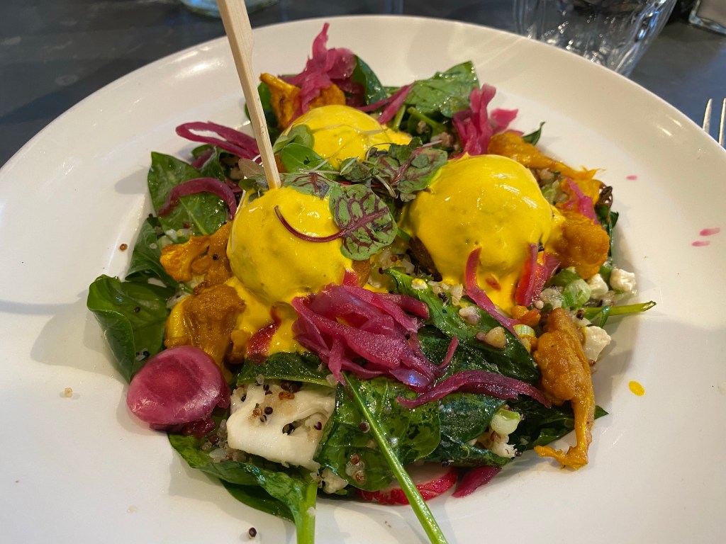 I opted for a spiced cauliflower and butternut squash falafel bowl, which came with pickled red onions (a favourite of late) and a turmeric and mint soy yoghurt as a dressing. I often like to try a vegan dish, especially when it’s packed full of flavour like this.
