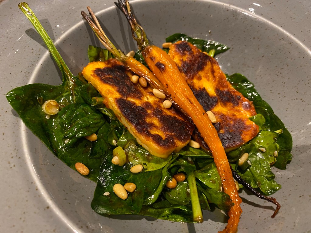 Starters include dishes like crab pate, courgette & sweetcorn fritters, bourbon-spiced belly pork, but I opted for the spicy halloumi with a honey and sesame dressing. It came with spinach, pine nuts, carrots, spring onions and a balsamic glaze. The flavours were great, although perhaps the halloumi was slightly over for my liking. But we didn’t wait too long to be served and I was still enjoying my G&T when the starter arrived. (They have a whole load of local gins to try.)