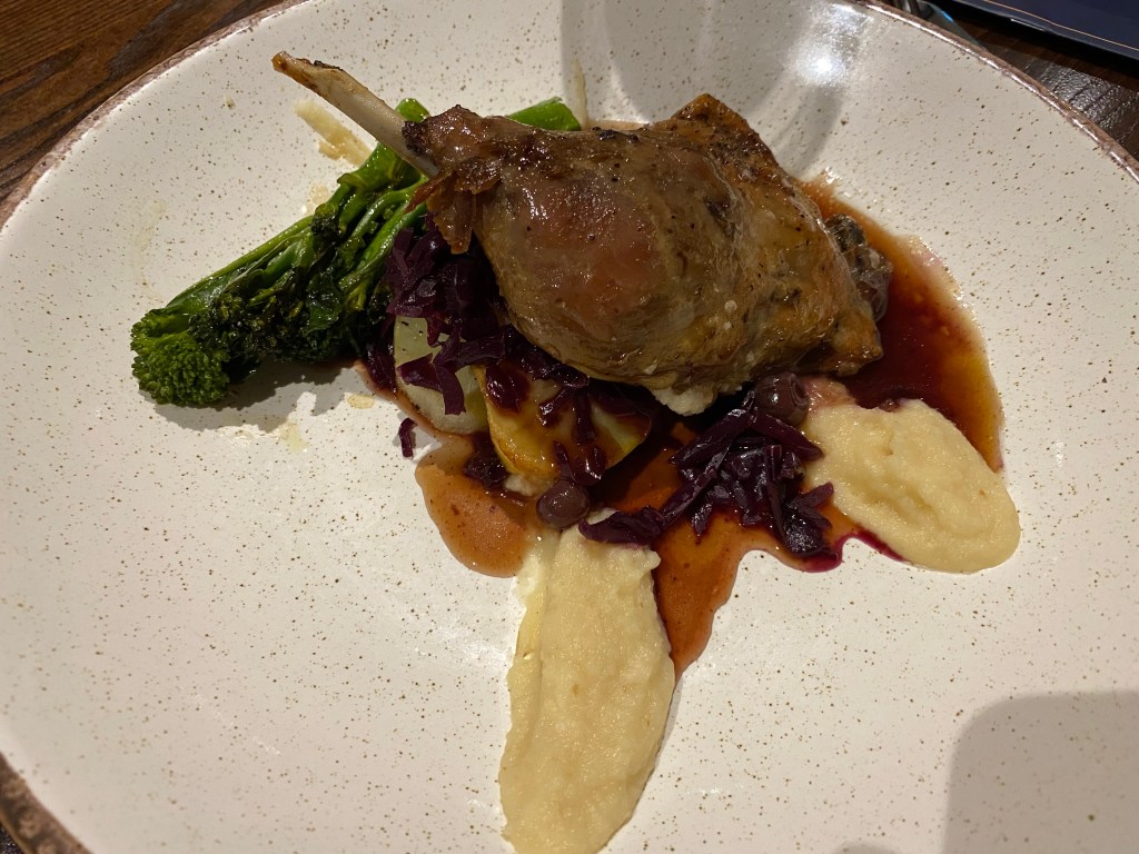 I went for a confit duck leg with stove potatoes, celeriac puree, braised red cabbage, broccoli and apparently a blueberry duck jus. I wouldn’t have known there was blueberry in the jus, but the whole thing had lovely, rich flavours and the duck fell apart, as should be expected.