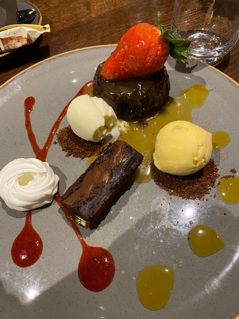 When it came, it was enormous! For scale, the strawberry in the photo is one of the biggest I’ve seen. Under that is a sticky toffee pudding, there was a chocolate log type of thing, a coconut ice cream, a mango sorbet and a meringue! This was definitely a situation where less would have been more – I found it a bit over facing. But I battled on through most of it and it all tasted great. There was more than enough to satisfy two people.
