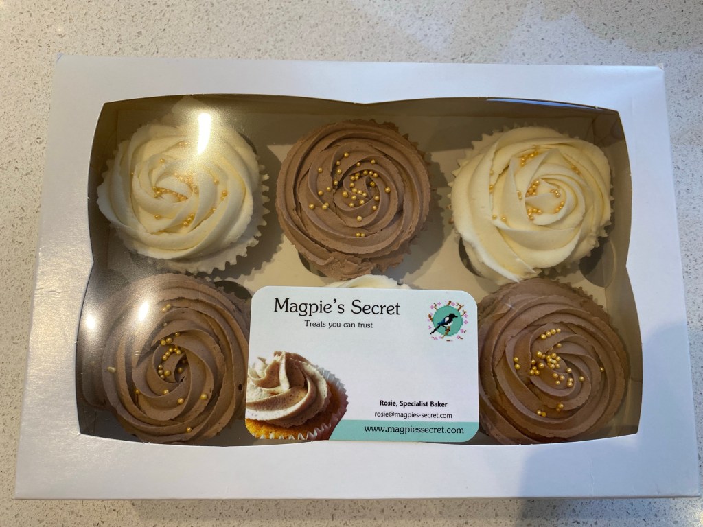 Very occasionally, Steeliac gets me a treat. I’ve had the odd free meal when a new gluten free menu has been launched or trialled, but 99% of what’s on the blog is just my own experience as a consumer. However, this week, a pleasant surprise dropped into my inbox, from Rosie at Magpie’s Secret, asking if I wanted to try out her cupcakes. Obviously, being keen to support local gluten free business, it didn’t take me long to say yes. And a couple of days later, these vanilla and chocolate beauties turned up.
