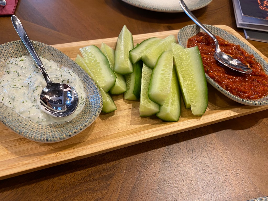 A dish very quickly arrived containing some very pillowy-looking bread in between two dips. Obviously that wasn’t gluten free at all, but we were immediately offered an alternative of the dips with cucumber sticks instead. To be honest, my initial reaction was disappointment about the lack of a gluten free bread for dipping, but in reality, we were better off with cucumber given the gigantic meals we were about to devour!