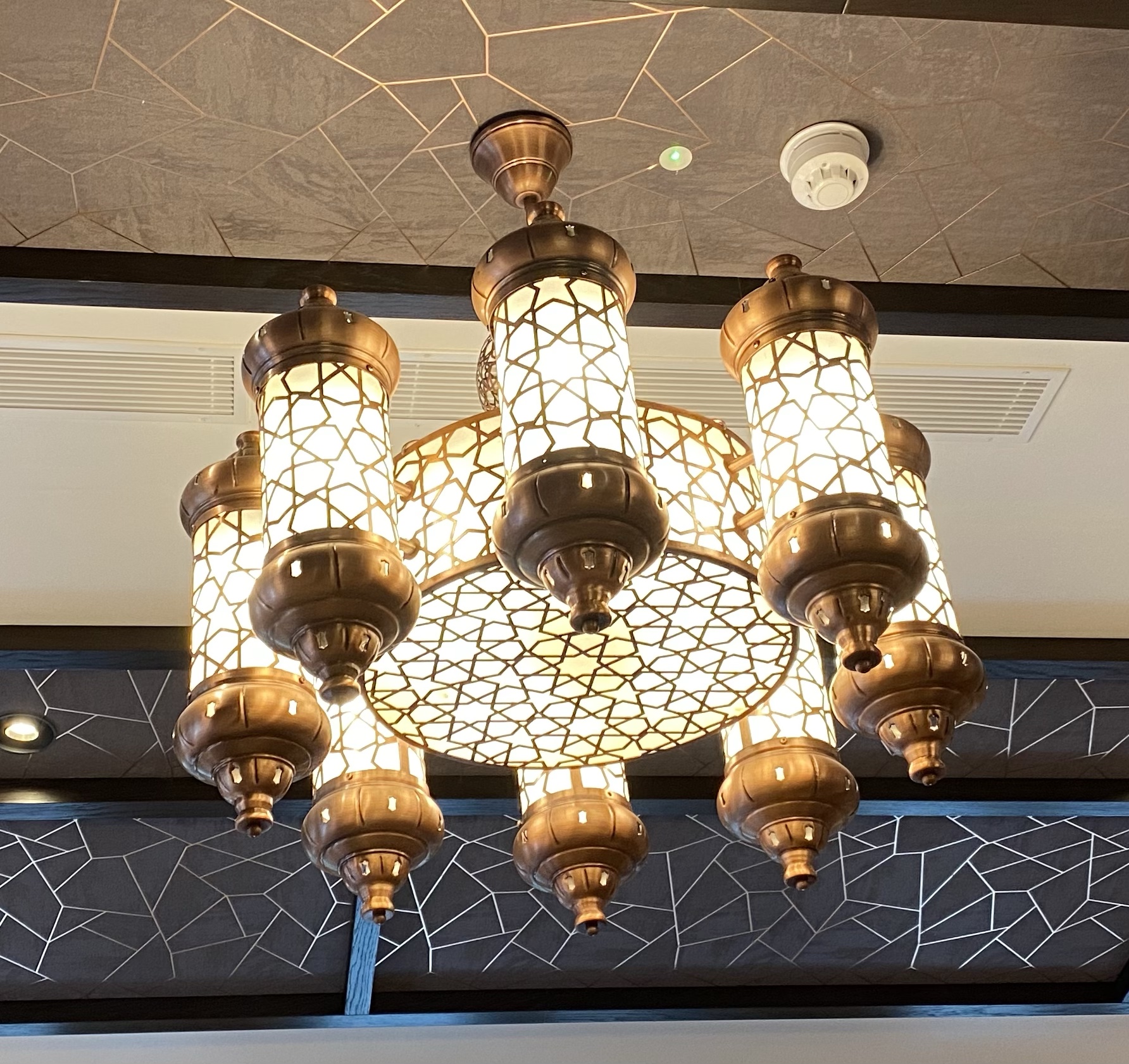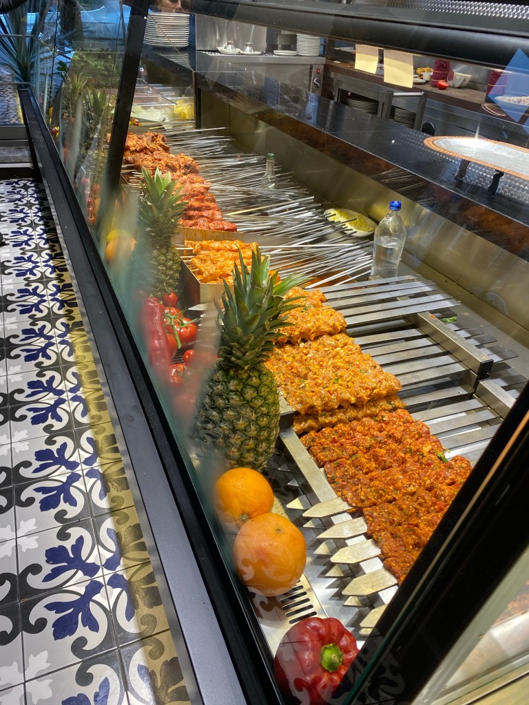 Once you step inside, you’d have no idea you were standing in an ex supermarket. They have gone to town on the design, with authentic-looking floor tiles, geometric wall surfaces and eye catching light fittings. The first things that greets you are a huge counter displaying all their meat on massive skewers and a wonderful chargrill spicy aroma.