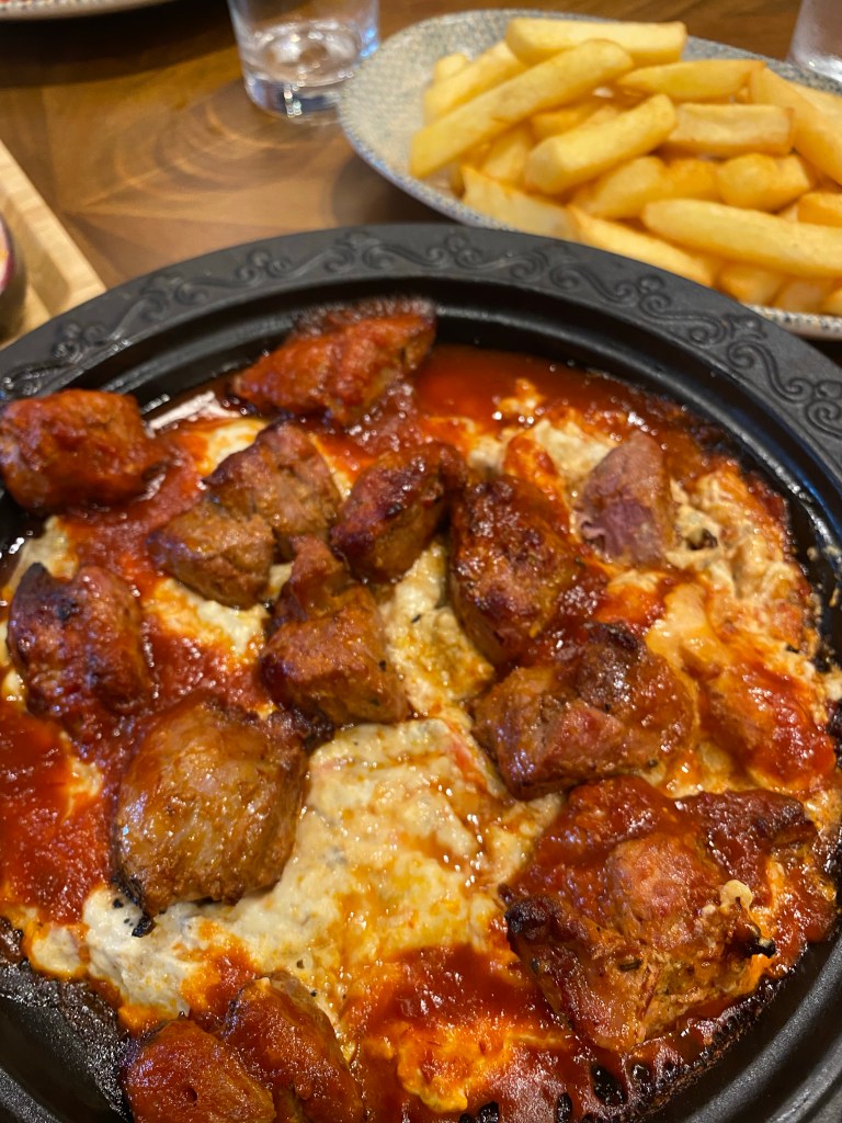Once seated upstairs, we were given menus that appeared to have gluten free dishes marked on but it looked like they had only got as far as the mezze dishes. There were plentiful GF options here, with hummous, baba ganoush, halloumi and mushroom, prawns, Turkish sausage and others. However, the charcoal grill main courses didn’t seem to have any GFs. When we asked our waitress, we were told that although most of the meat elements are gluten free, many are served with bread and / or rice containing vermicelli. However, they do have a separate chip fryer, so any of the main courses can be served with chips instead, or baby potatoes. Phew! (Another significant component of the menu is Turkish pizzas, which are definitely not gluten free, but there remained plenty to choose from.)
