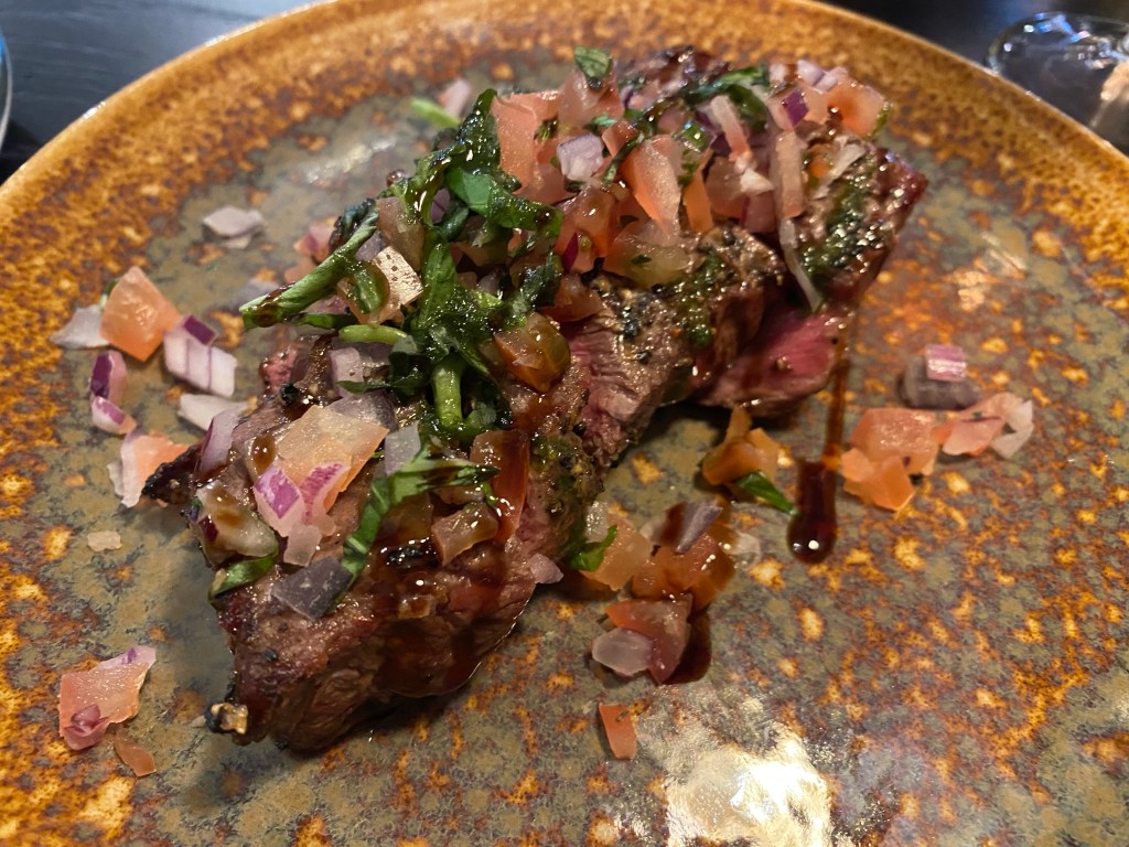 The menu is Italian inspired and has gluten free and gluten free options marked on, which made it nice and easy. I started with a bavette steak, which was pretty generous – a chargrilled steak, cooked pink, with a tomato salsa and rocket leaves. A good Yorkshire portion and I really enjoyed it. Other options were soup, king prawns and burrata.