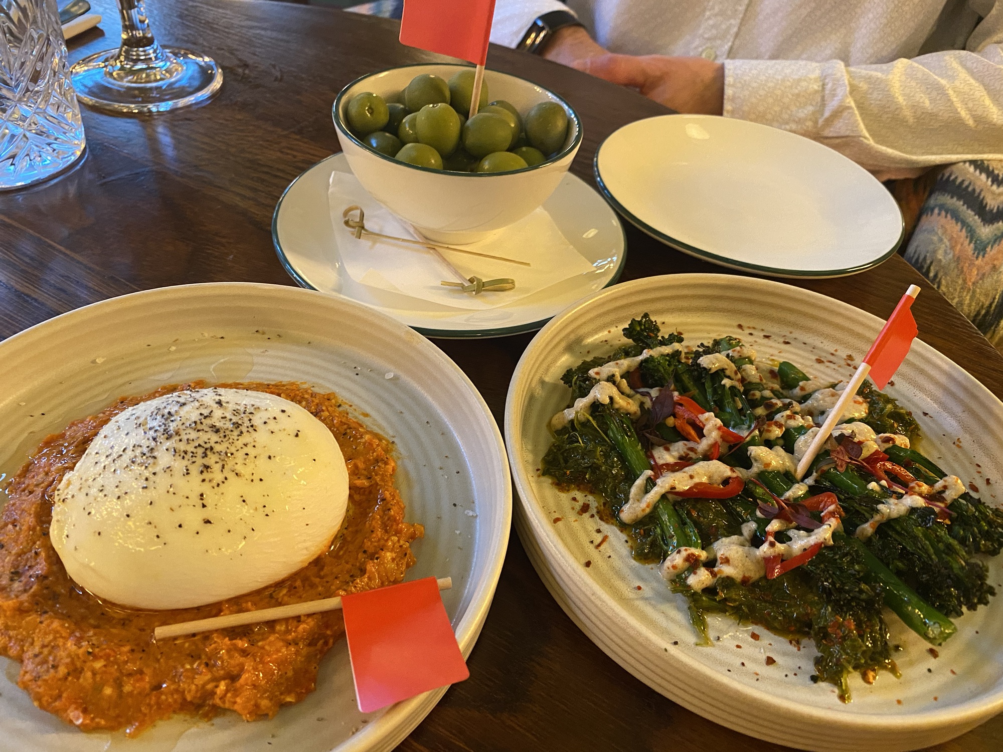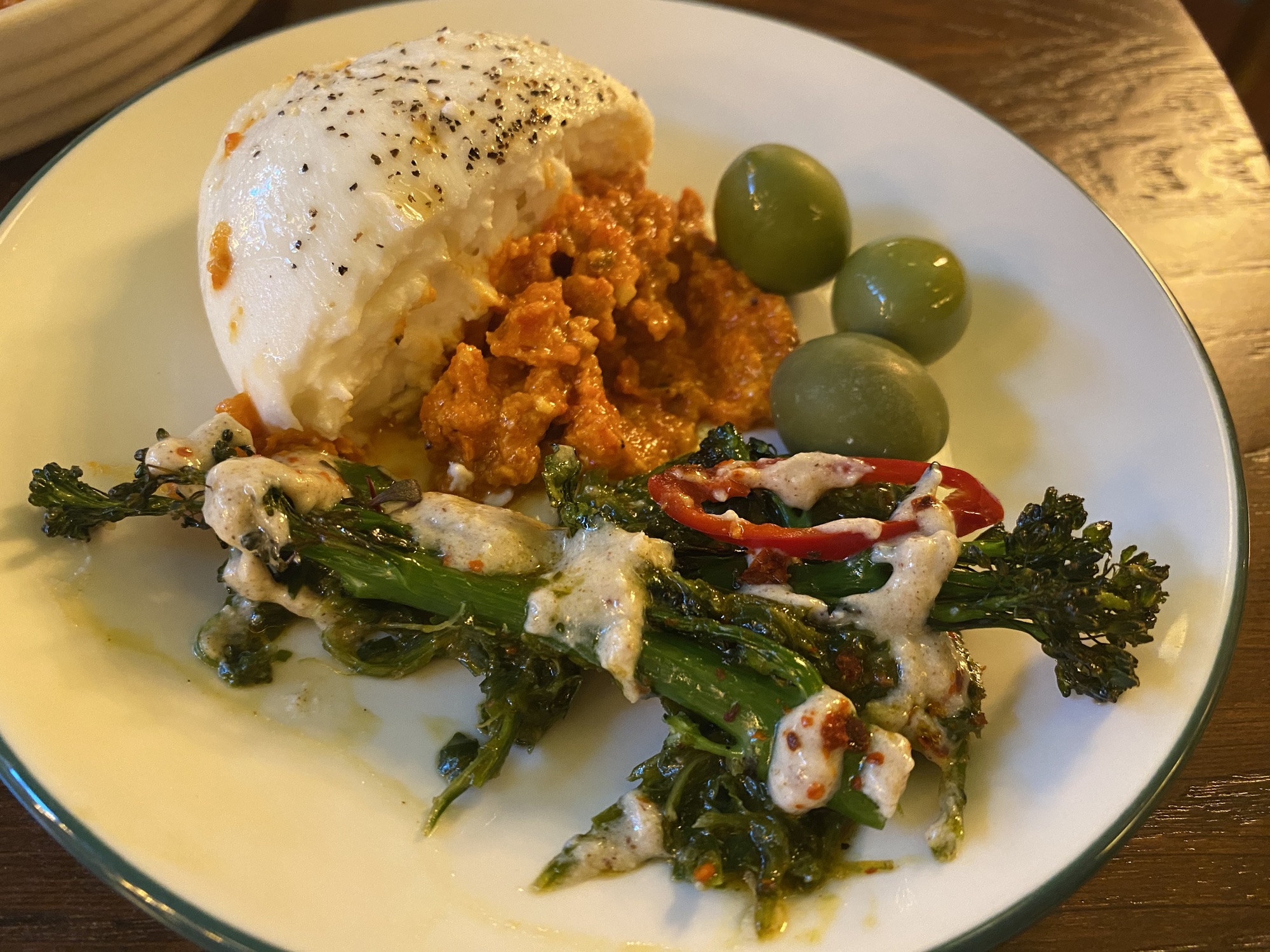 We decided to share a couple of small plates for starters – Nocellara olives (really big ones!), burrata cheese and smoked piquillo pesto, and chermoula tenderstem broccoli with caramelised butter and pickled red chilli – and they all came with their little allergen flags! There is an excellent choice of gluten free options, including a few to try next time (tempura vegetables and N’duja glazed butterbeans). The broccoli was my favourite, absolutely packed with flavour.