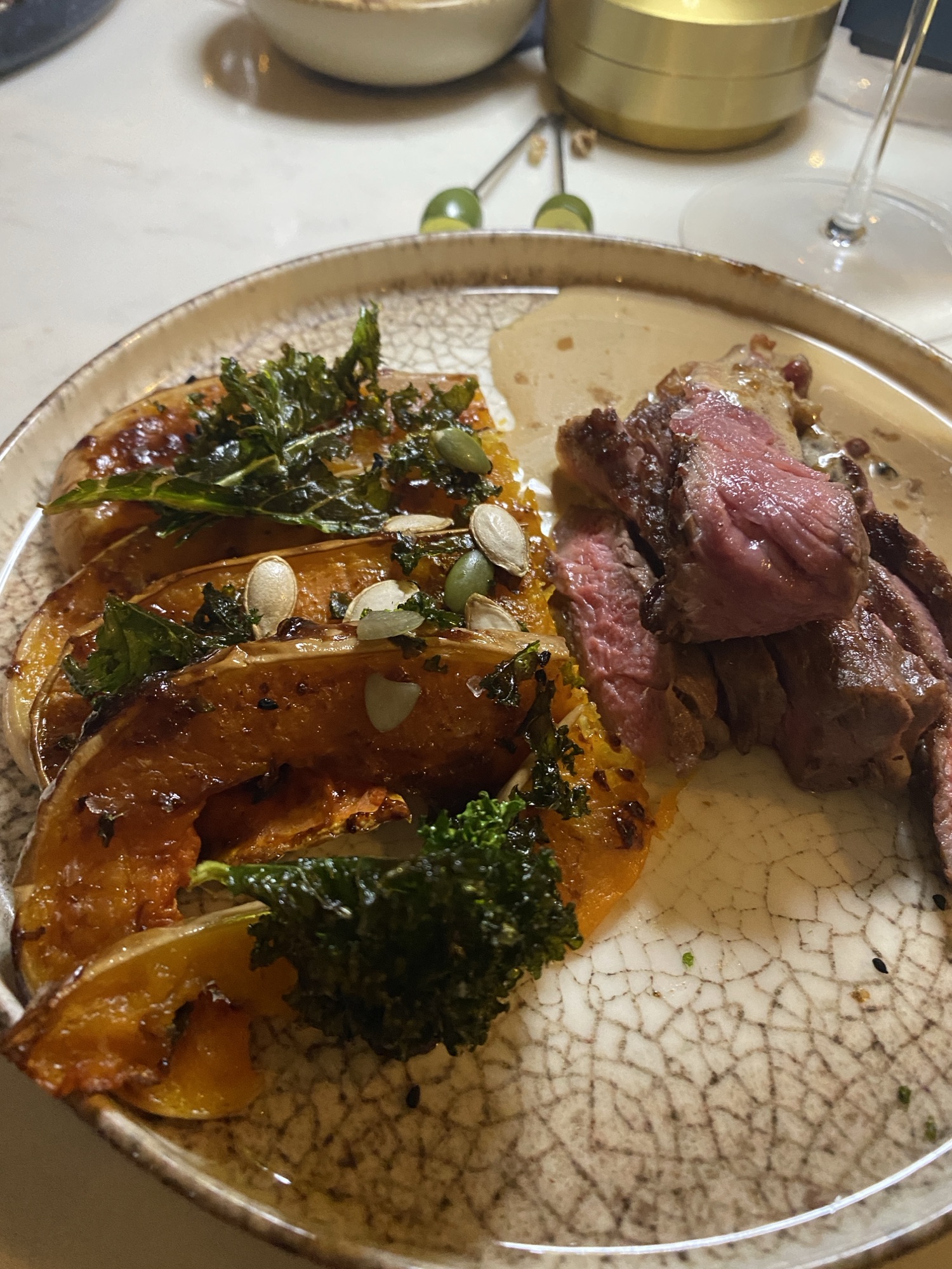 It wasn’t a cheap evening, owing to the quantity and variety of wine consumed, but prices for the food varied from £4-5 for the nibbles, up to £28 for the ribeye. The squash was one of their ‘smaller plates’, at around the £10 mark.